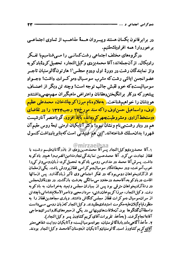 [۱] . در صفحه ۱۷۲ کتاب «یادداشتهای اوسینکو» آمده است: «[میرزا کوچک خان] برای نخستین بار در ماجرای مشروطهخواهی مردم در تحص مردم رشت در برابرکنسولگری انگلیس حضور یافته …» در توضیح باید گفت که این کتاب از اساس جعلی است!.