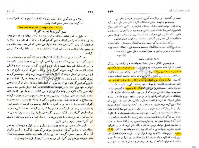 - ناظم السلام کرمانی همان نامه را با مضمونی صد در صد متفاوت منتشر کرده که طی آن متحصنین از یک عالِم شناخته شده گیلانی که آنان را عدّای جُهّال و نادان نامیده شکایت کردهاند.